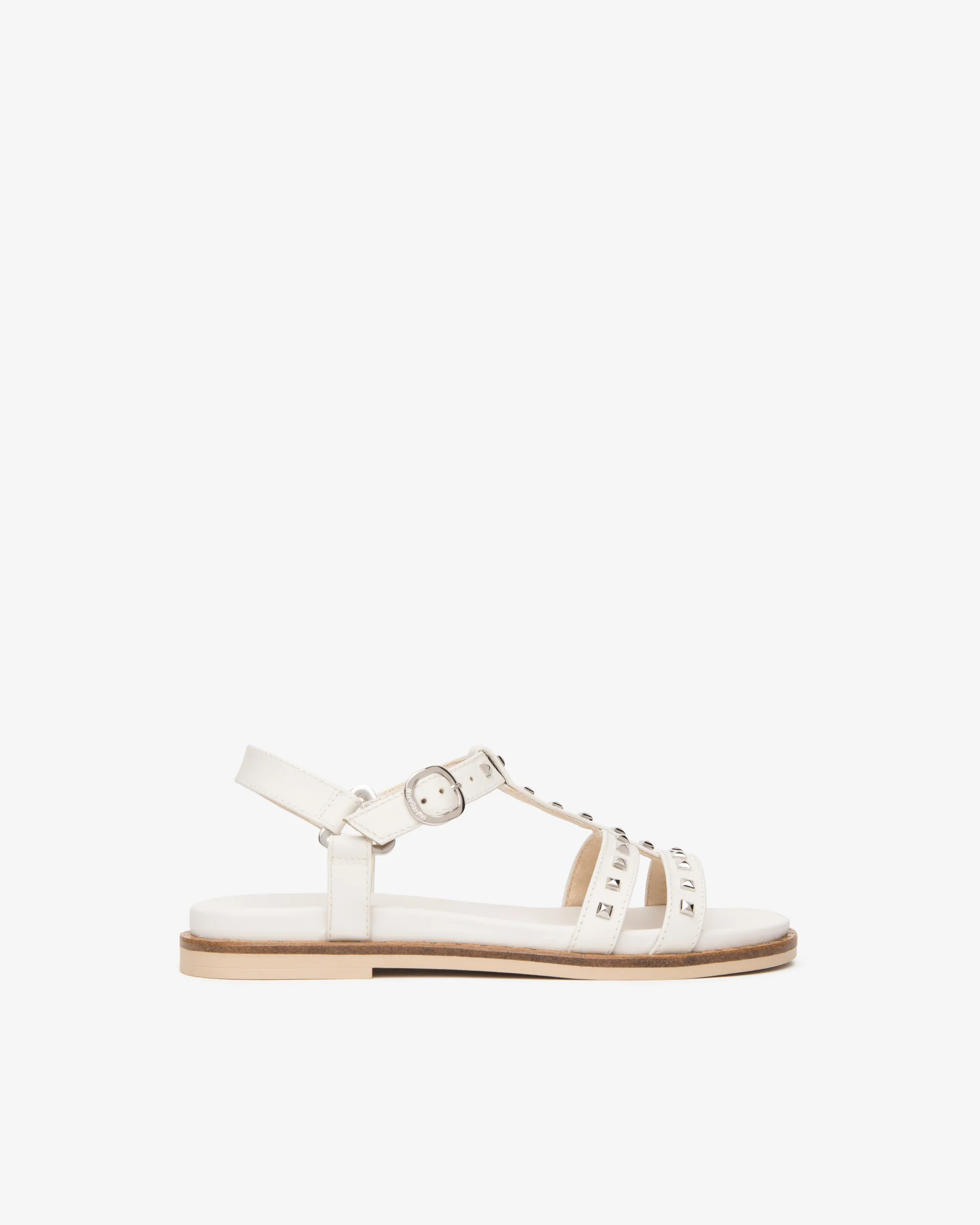 Chic and versatile, these off-white flat sandals feature multiple slim straps adorned with polished stud details for a modern edge. The adjustable ankle buckle ensures a secure fit, while the cushioned sole offers all-day comfort. Perfect for pairing with casual outfits or adding a stylish touch to summer looks.
